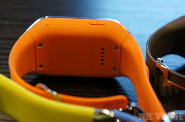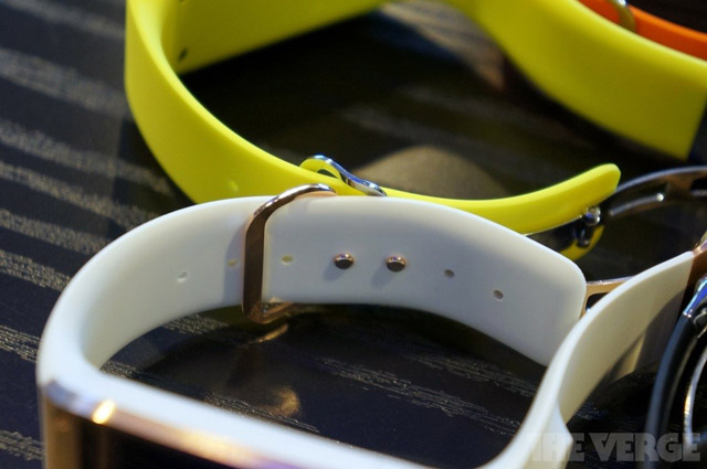 Dây đeo được làm rất đẹp với họa tiết vân sọc. Chưa rõ chất liệu tạo nên dây đeo này là gì nhưng cảm giác rất chắc chắn. Dây đeo khá liền lạc với mặt đồng hồ, tạo nên một chiếc đồng hồ mang hơi hướng thể thao. Một bên dây đeo được Samsung bố trí camera 1.9 MP. Cụm camera lồi lên giống như kiểu Lumia 1020. Cá nhân người viết cảm thấy vị trí cụm camera chính là điểm trừ trong thiết kế, trông nó hơi thô thiển.
